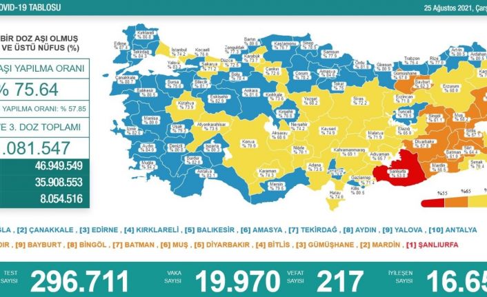 Sağlık Bakanlığı tarafından Türkiye’nin yeni korona virüs tablosu açıklandı. 25 Ağustos’ta açıklanan 24 saatlik verilere göre 19 bin 970 vaka tespit edildi. Virüs nedeniyle hayatını kaybedenlerin sayısı 217 oldu. Bir günde toplam 296 bin 711 test yapılırken iyileşen hasta sayısı 16 bin 651 olarak kaydedildi. Sağlık Bakanlığınca açıklanan tabloda, aşılama verilerine de yer verildi. En az 1 doz aşı olmuş 18 yaş üzeri nüfusu kapsayan verilere göre Türkiye’de 1. doz aşılama ortalama yüzde 75,64 oldu. 2. doz ortalaması yüzde 57,85 olurken, 1., 2. ve 3. doz aşısını olan vatandaş sayısı toplamda 91 milyon 81 bin 547’e yükseldi.