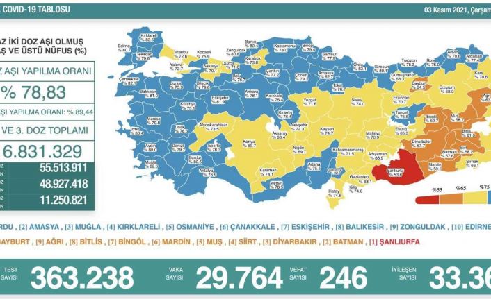 Sağlık Bakanlığı tarafından Türkiye’nin yeni korona virüs tablosu açıklandı 3 Kasım’da açıklanan 24 saatlik verilere göre 29 bin 764 vaka tespit edildi. Virüs nedeniyle hayatını kaybedenlerin sayısı 246 oldu. Bir günde toplam 363 bin 238 test yapılırken, iyileşen hasta sayısı 33 bin 366 olarak kaydedildi. Sağlık Bakanlığı tarafından açıklanan tabloda, 2 doz aşılama verilerine de yer verildi. En az 2 doz aşı olmuş 18 yaş üzeri nüfusu kapsayan verilere göre Türkiye’de 2. doz aşılama ortalama yüzde 78,83 oldu. 1. doz ortalaması yüzde 89,44 olurken, 1., 2. ve 3. doz aşısını olan vatandaş sayısı toplamda 116 milyon 831 bin 329 ’a yükseldi.