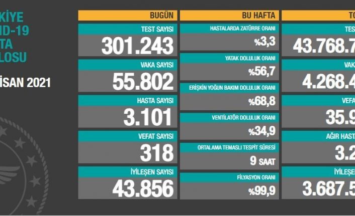 Sağlık Bakanlığı, son 24 saatte 318 kişinin korona virüsten hayatını kaybettiğini, 55 bin 802 yeni vaka sayısının olduğunu açıkladı.