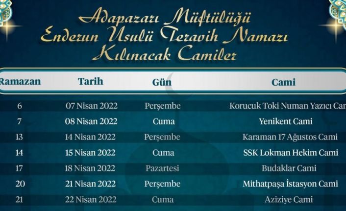 Osmanlı döneminde Enderun Mektebinde ortaya çıkan ve sonrasında birçok camiye yayılan enderun usulü teravih, günümüzde de devam ediyor. Uzun teravih namazlarını ilahi, salavat ve tekbirlerle güzelleştiren, beş ayrı makam icra edilerek kılınan enderun usulü teravih namazı Sakarya’nın Adapazarı ilçesinde 9 camide uygulanacak. Adapazarı Müftülüğünce düzenlenen programa göre; ilçede bulunan 9 camide, ramazanın belirli günlerinde eda edilecek. Enderun usulü teravih namazı kılınacak camilerin listesi ise şu şekilde paylaşıldı; 7 Nisan Perşembe günü Korucuk TOKİ Numan Yazıcı Cami, 8 Nisan Cuma günü Yenikent Cami, 14 Nisan Perşembe günü Karaman 17 Ağustos Cami, 15 Nisan Cuma günü Lokman Hekim Cami, 18 Nisan Pazartesi günü Budaklar Cami, 21 Nisan Perşembe günü Mithatpaşa İstasyon Cami, 22 Nisan Cuma günü Aziziye Cami, 23 Nisam Cumartesi günü Orhan Cami ve 28 Nisan Cuma günü ise Mesudiye Cami.