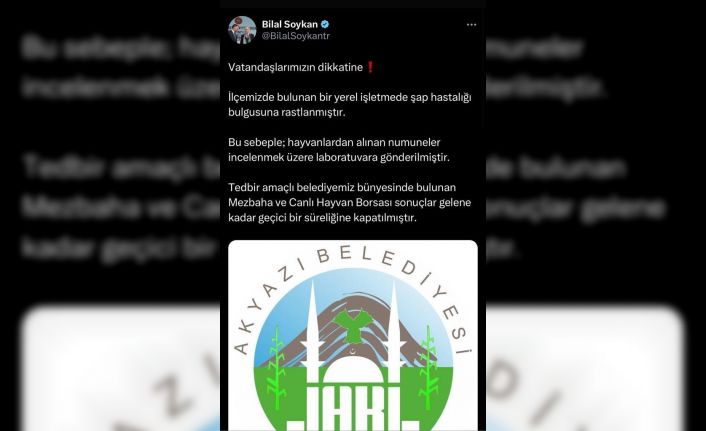 İlçede bir işletmede şap hastalığı bulgusuna rastlanması üzerine ekipler alarma geçti. İlçe Tarım ve Hayvancılık Müdürlüğü ekipleri alınan numuneleri laboratuvara gönderdi. Neticeler çıkana kadar ise ilçeye hayvan giriş ve çıkışları kapatılırken, Akyazı Belediye Başkanı Bilal Soykan ise Mezbaha ve Canlı Hayvan Borsasının geçici süreliğine kapatıldığını açıkladı. Soykan, sosyal medyadan yaptığı paylaşımda, “İlçemizde bulunan bir yerel işletmede şap hastalığı bulgusuna rastlanmıştır. Bu sebeple hayvanlardan alınan numuneler incelenmek üzere laboratuvara gönderilmiştir. Tedbir gayesiyle belediyemiz bünyesinde bulunan Mezbaha ve Canlı Hayvan Borsası neticeler gelene kadar geçici bir süreliğine kapatılmıştır” ifadelerine yer verdi.