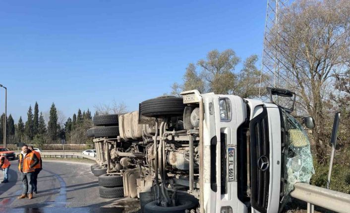 Anadolu Otoyolu Adapazarı gişeleri bağlantı yolunda sürücüsünün kontrolünden çıkan tır devrildi. Kazada sürücü yaralandı.
