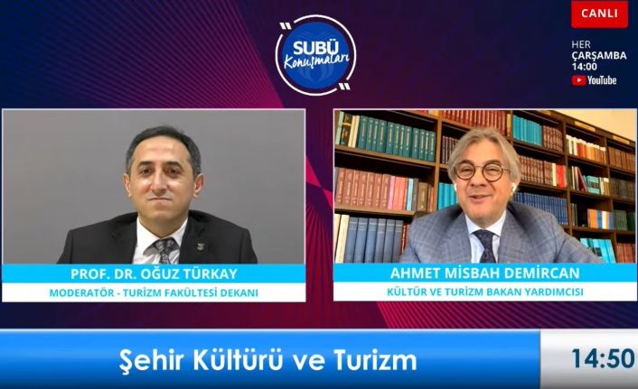 SUBÜ tarafından düzenlenen SUBÜ Konuşmaları’nın 10. konuşmacısı, Kültür ve Turizm Bakan Yardımcısı Ahmet Misbah Demircan oldu. Moderatörlüğünü SUBÜ Turizm Fakültesi Dekanı Prof. Dr. Oğuz Türkay’ın gerçekleştirdiği ‘Şehir Kültürü ve Turizm’ başlıklı söyleşide, kültür ve sanatın gelişimi, şehir kültürünün oluşumu ve turizme etkisi, İstanbul’un turizm çevresinin genişletilmesi, Türkiye’de kültür turizmi destinasyonları, bir turistik tanıtım unsuru olarak sinema ve kültürel varlıkların korunmasında vakıfların önemi gibi konular ele alındı. Sanatı, değişimi içselleştirip kendi temel değerleriyle uyumlu hale getirmek olarak tanımlayan Kültür ve Turizm Bakan Yardımcısı Ahmet Misbah Demircan, sanatın teknolojik ve çağdaş olması gerektiğini vurguladı.