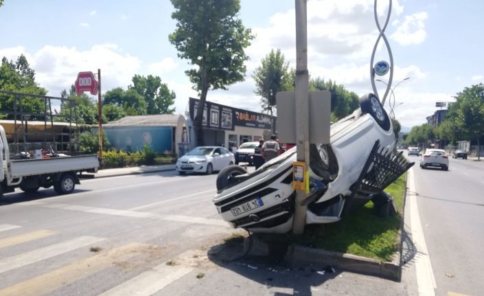Sakarya’nın Adapazarı ilçesinde önündeki servis aracına çarpmamak için sürücüsünün manevra yaptığı otomobil, refüje çarparak ters döndü. Meydana gelen kazada sürücü yaralandı.