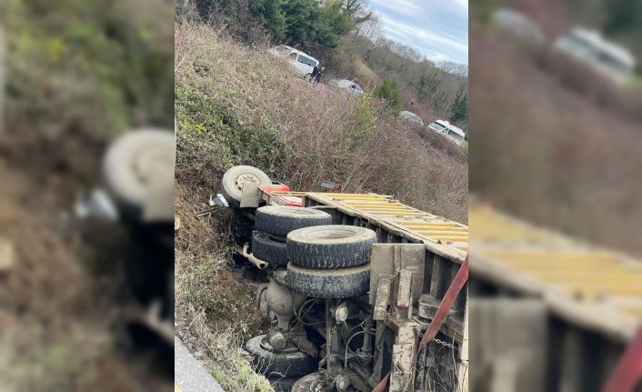 Sakarya’nın Kaynarca ilçesinde sürücüsünün kontrolünden çıkan kamyon yol kenarındaki boş araziye devrildi.
