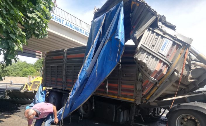 Sakarya’nın Karasu ilçesinde bulunan limandan aldığı yükü şehir merkezine doğru götüren tırın römorkunun açılarak üst geçide çarpması neticesinde meydana gelen kazada maddi hasar oluştu.