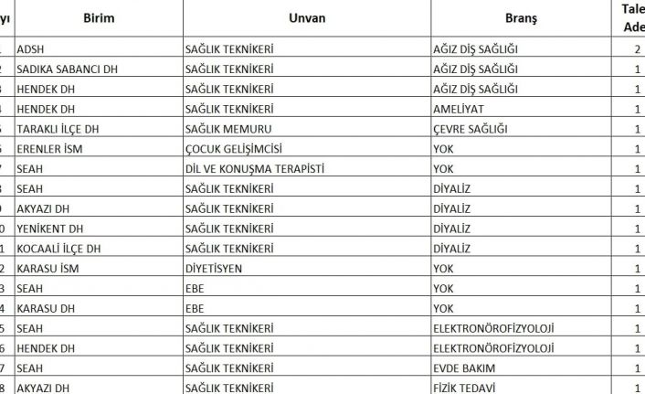 Sağlık Bakanlığı, merkez ve taşra teşkilatında görevlendirilmek üzere 15 bin 342 sözleşmeli personel ve 3 bin 658 işçi alımı gerçekleştirecek. Sağlık Bakanı Prof. Dr. Kemal Memişoğlu sosyal medya üzerinden yaptığı, "KPSS sonuçlarına göre ÖSYM tarafından yapılacak merkezi yerleştirme ile toplam 15 bin 342 personel alımı gerçekleştirilecektir" açıklama ile personel alımını gerçekleştirileceğini duyurdu. Bu çerçevede Sağlık Bakanlığı personel alımı branş dağılımı yayımlanan kılavuz ile birlikte belli oldu. Sakarya’da 215 personelin alınacağı branşlar arasında sağlık teknikeri, sağlık memuru, çocuk gelişimcisi, dil ve konuşma terapisti, diyetisyen, ebe, fizyoterapist, hemşire, sağlık fizikçisi, temizlik hizmetleri, bakım onarım teknik destek kadroları yer aldı. Sakarya’ya atanacak olan 215 personel; Sakarya İl Sağlık Müdürlüğü, Sakarya Eğitim ve Araştırma Hastanesi, Yenikent Devlet Hastanesi, Sadıka Sabancı Devlet Hastanesi, Ağız ve Diş Sağlığı Hastanesi, Hendek Devlet Hastanesi, Taraklı İlçe Devlet Hastanesi, Kocaali İlçe Devlet Hastanesi, Karasu Devlet Hastanesi, Pamukova Devlet Hastanesi, Akyazı Devlet Hastanesi, Kaynarca İlçe Devlet Hastanesi. Ferizli İlçe Devlet Hastanesi, Sapanca İlçe Devlet Hastanesi, Halk Sağlığı Laboratuvarı ve sağlık ocaklarında görev yapacak.