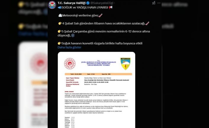 Sakarya Valiliği, meteorolojik verilere göre 4 Şubat Salı gününden itibaren hava sıcaklıklarının azalacağı, 5 Şubat Çarşamba günü ise mevsim normallerinin 6 ila 12 derece altına düşeceği soğuk ve yağışlı havaya karşı uyardı. Valiliğin sosyal medya hesabından yapılan paylaşımda, "Meteoroloji verilerine göre; 4 Şubat Salı gününden itibaren hava sıcaklıklarının azalacağı, 5 Şubat Çarşamba günü mevsim normallerinin 6-12 derece altına düşeceği, soğuk havanın kuvvetli rüzgarla birlikte hafta boyunca etkili olacağı, ayrıca söz konusu periyotta karla karışık yağmur ve kar yağışlarının görüleceği tahmin edilmektedir. Yaşanabilecek olumsuz durumlara karşı dikkatli ve tedbirli olunması gerekmektedir" denildi.