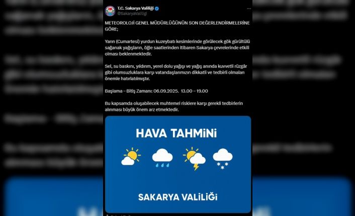 Yapılan açıklamada, 6 Eylül Cumartesi günü 13.00 ile 19.00 saatleri arasında il genelinde gök gürültülü sağanak yağışların beklendiği belirtildi. Sel, su baskını, yıldırım, yerel dolu ve yağış anında kuvvetli rüzgar gibi olumsuzluklara karşı dikkatli olunması istendi. Valiliğin sosyal medya hesabından yapılan paylaşımda, "Meteoroloji Genel Müdürlüğü’nün son değerlendirmelerine göre; yarın (Cumartesi) yurdun kuzeybatı kesimlerinde görülecek gök gürültülü sağanak yağışların, öğle saatlerinden itibaren Sakarya çevrelerinde etkili olması beklenmektedir. Sel, su baskını, yıldırım, yerel dolu yağışı ve yağış anında kuvvetli rüzgar gibi olumsuzluklara karşı vatandaşlarımızın dikkatli ve tedbirli olmaları önemle hatırlatılmıştır. Bu çerçevede oluşabilecek muhtemel risklere karşı gerekli tedbirlerin alınması büyük önem arz etmektedir" ifadeleri yer aldı.