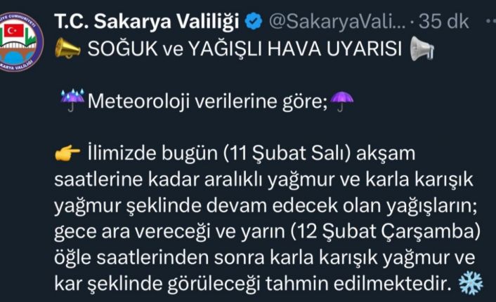 Sakarya Valiliği, meteorolojik verilere göre il genelinde akşam saatlerine kadar aralıklı yağmur ve karla karışık yağmur şeklinde yağışların olacağını, gece yarısı ve Çarşamba günü ise öğle saatlerinden itibaren karla karışık yağmur ve kar yağışına karşı vatandaşlara sosyal medya hesabı üzerinden uyarıda bulundu. Valilik tarafından yapılan paylaşımda, "Meteoroloji verilerine göre; İlimizde bugün (11 Şubat Salı) akşam saatlerine kadar aralıklı yağmur ve karla karışık yağmur şeklinde devam edecek olan yağışların; gece ara vereceği ve yarın (12 Şubat (Çarşamba) öğle saatlerinden sonra karla karışık yağmur ve kar şeklinde görüleceği tahmin edilmektedir. Yağışların yarın akşam saatlerinde örtü bırakması ve soğuk havanın etkisiyle, buzlanma ve don olayı beklenmektedir. Yaşanabilecek olumsuz durumlara karşı dikkatli ve tedbirli olunması gerekmektedir" denildi.
