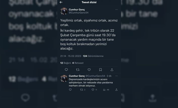 Tüm gelirin depremzedelere bağışlanması adına oynanacak Sakaryaspor-Kocaelispor müsabakası öncesinde sosyal medya hesabı üzerinden açıklamada bulunan Sakaryaspor Kulübü Başkanı Cumhur Genç, “22 Şubat Çarşamba günü saat 19.30’da oynanacak yardım maçında bir tane boş koltuk bırakmadan yerimizi alacağız” dedi.