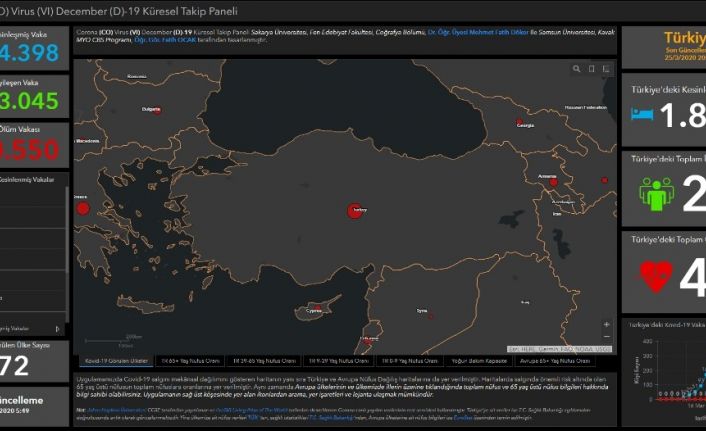 Küresel Takip Paneli, Sakarya Üniversitesi (SAÜ) Fen Edebiyat Fakültesi Coğrafya Bölümü öğretim üyesi ve SAÜ Afet Yönetim Uygulama ve Araştırma Merkezi Coğrafi Bilgi Teknolojileri Çalışma Grubu Başkanı Dr. Öğr. Üyesi Mehmet Fatih Döker ile Samsun Üniversitesi Coğrafi Bilgi Sistemleri Bölümü Öğr. Gör. Fatih Ocak’ın ortak çalışmalarıyla oluşturuldu. Tasarlanan panel, hem dünyada hem de salgının görüldüğü ülkelerde enfekte olan, iyileşen ve ölen vaka sayılarının güncel olarak takip edilmesine olanak sağlayacak. Ayrıca panel üzerinden illerdeki yaş aralıklarının nüfusa göre dağılımı ve hastanelerin yoğun bakım kapasiteleri de görüntülenebilecek.