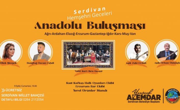 Serdivan Belediyesi Kültür ve Sosyal İşler Müdürlüğü tarafından düzenlenen Serdivan Hemşehri Geceleri programları Balkan Rumeli ve Karadeniz Buluşmasının ardından Anadolu Buluşması ile devam ediyor. Yapılan açıklamada; Ağrı, Ardahan, Elazığ, Erzurum, Kars, Gaziantep, Iğdır, Muş ve Van illerinin tanıtımlarının yapılacağı programda vatandaşların konserler ve etkinliklerle unutulmaz bir gece yaşayacağı ifade edildi.