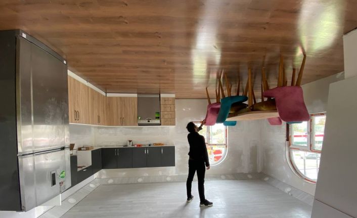 Sakarya Büyükşehir Belediyesi tarafından yapımına başlanan Ters Ev projesi tamamlanıyor. 300 metre kare alan üzerine inşa edilen 190 metrekarelik Ters Ev’in içerisinde devam eden montaj çalışmaları tamamlandığında, Sakarya yeni sosyal yaşam alanına kavuşacak.