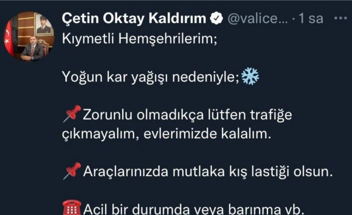 Meteorolojinin uyarıları sonrasında Sakarya’da dün kar yağışı etkisini göstermeye başladı. Şiddetini arttırması beklenen yağış ile alakalı Sakarya Valisi Çetin Oktay Kaldırım, sosyal medya hesabından vatandaşları uyardı. Zorunlu olmadıkça trafiğe çıkılmaması konusunda uyaran Kaldırım, “Kıymetli hemşehrilerim; yoğun kar yağışı nedeniyle, zorunlu olmadıkça lütfen trafiğe çıkmayalım, evlerimizde kalalım. Araçlarınızda mutlaka kış lastiği olsun. Acil bir durumda veya barınma vb. ihtiyacı olanlar için 112 Acil Çağrı Merkezimiz 7/24 hizmetinizde” ifadelerine yer verdi.