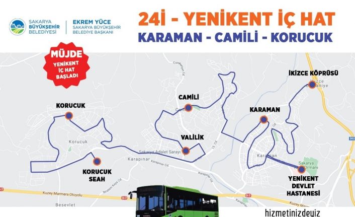 Sakarya Büyükşehir Belediyesi tarafından Yenikent bölgesinde sefer yapacak 24İ hattı hizmete başladı. Bölgede bulunan Karaman, Camili ve Korucuk mahalleleri arasında ulaşımlar için vatandaşların yoğun taleplerinin ardından harekete geçen Büyükşehir Belediyesi, oluşturulan güzergâhta iç hat güzergahını hizmete sundu.