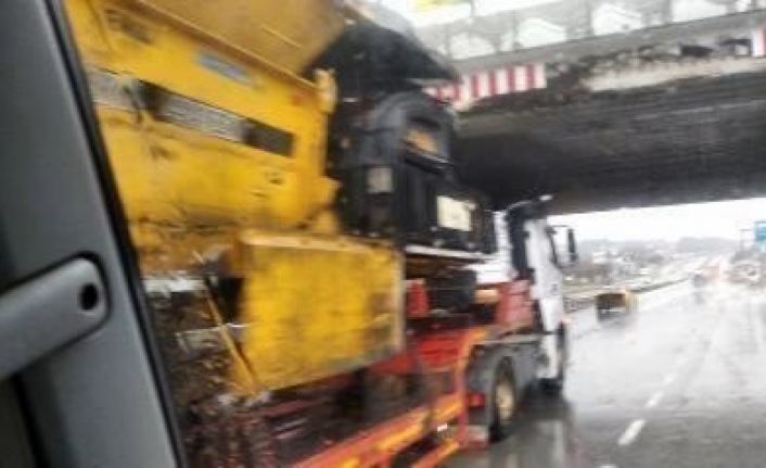 Sakarya D-100 Karayolu’nda iş makinesi yüklü tır beton üst geçide çarptı. Yüzlerce aracın geçtiği noktada tahribatın ufak çapta olması facianın önüne geçti.