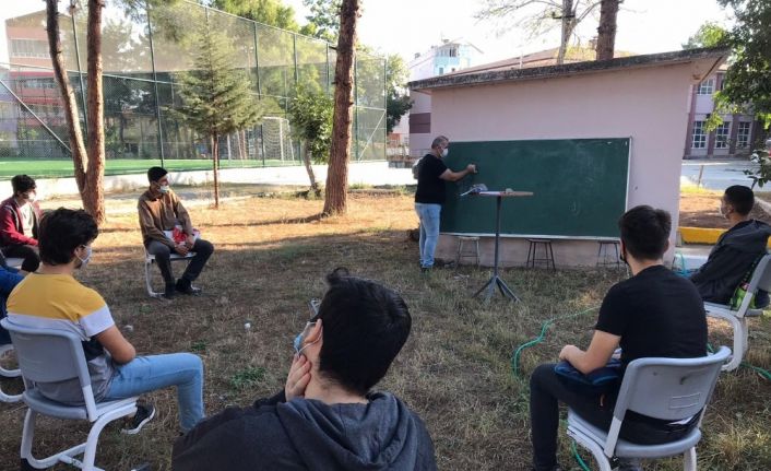 Okulun matematik öğretmeni Tanju Altun tarafından 12. sınıf öğrencilerine matematik dersi pandemi nedeniyle okulun bahçesinde oluşturulan açık hava sınıfında işleniyor. Bahçeye yerleştirilen sandalyelere fiziksel mesafeyi koruyarak oturan öğrenciler eğitimlerine devam ediyor.