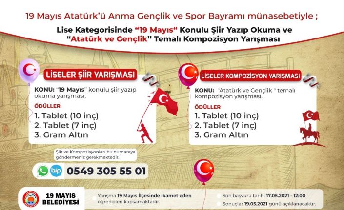 19 Mayıs Atatürk’ü Anma, Gençlik ve Spor Bayramı dolayısıyla, ilçede ikamet eden lise öğrencilerini kapsayan ve isteyen öğrencilerin “19 Mayıs” konulu şiir yazıp-okuyup videosunu göndermesi, isteyen öğrencilerin ise “Atatürk ve Gençlik” konulu kompozisyon yazıp göndermesi ile düzenlenecek olan yarışmanın son başvuru tarihi 17 Mayıs 2021 saat 12.00 olarak belirlendi.