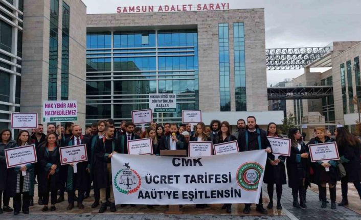 Samsun’da avukatlar CMK ücretlerinin avukatlık asgari ücret tarifesine yükseltilmesini isteyerek adliye önünde basın açıklamasında bulundu.