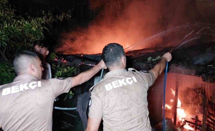 Samsun’da binaların arasındaki bir baraka alevlere teslim olurken, bekçiler yangına hortumla su tutarak ilk müdahaleyi yaptı.