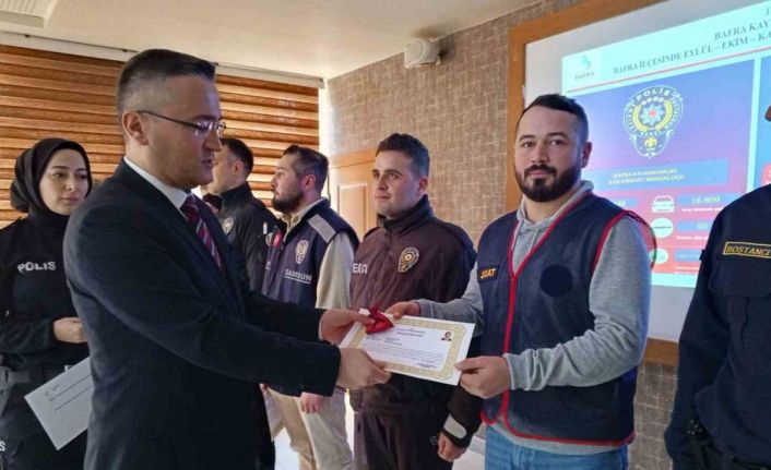 Bafra İlçe Emniyet Müdürlüğü ve İlçe Jandarma Komutanlığı bünyesinde görev yapan personellerin ilçe sınırları içerisinde 13 Ekim - 15 Aralık tarihleri arasında yapılan saha çalışmalarına ilişkin istatistiki çalışmalar sonucunda başarılı olan 18 polis, 4 bekçi ve 12 jandarma personeline başarılarından dolayı ödül ve başarı belgesi verildi.