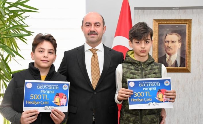 Terme Belediye Başkanı Ali Kılıç, İlçe Milli Eğitim Müdürlüğü tarafından ilçe genelindeki 6’ncı ve 7’nci sınıf öğrencileri arasında yürütülen "Okuyorum Projesi" kapsamında en çok kitabı okuyarak dereceye giren öğrencilere ödüllerini verdi.