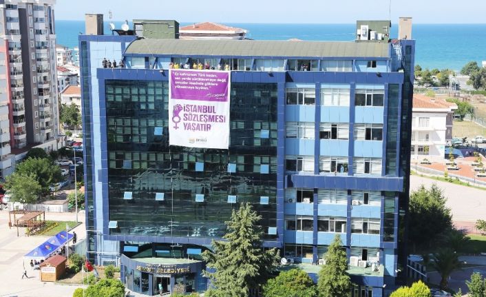 Atakum Belediyesi çalışanları, ’İstanbul Sözleşmesi’nin yürürlükte kalması için belediye hizmet binasına, üzerinde Mustafa Kemal Atatürk’ün bir sözü ile “İstanbul Sözleşmesi Yaşatır” mesajını içeren 75 metrekarelik dev bir pankart astı.