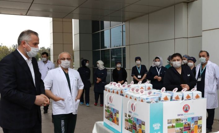 Bafra Belediye Başkanı Hamit Kılıç, korona virüsü ile mücadele eden sağlık çalışanlarına moral vermek adına ilçenin meşhur lezzeti olan ’Bafra nokulu’ ikram etti.