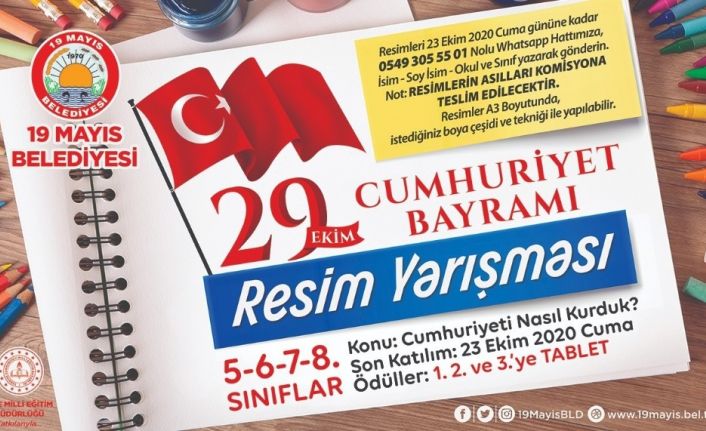 23 Nisan Ulusal Egemenlik ve Çocuk Bayramı, 19 Mayıs Gençlik ve Spor Bayramı’nda düzenlediği yarışmalarla dereceye giren öğrencilere bisiklet ve tablet hediye eden ayrıca katılan tüm öğrencilere çeşitli hediyeler gönderen 19 Mayıs Belediyesi, 29 Ekim Cumhuriyet Bayramı dolayısıyla düzenleyeceği yarışmada, İlçe Milli Eğitim Müdürlüğünün kuracağı komisyona havale edilecek olan resimler arasından dereceye girecek birinci, ikinci ve üçüncüye tablet ödülü verecek. İlçede ikametgâh eden ve öğrenim gören öğrenciler, isim-soy isim-okul ve sınıf yazarak, A3 boyunda istedikleri boya çeşidi ve boyama etkinliğini seçerek hazırladıkları resimlerini 23 Ekim 2020 Cuma gününe kadar 0549 305 55 01 numaralı whatsapp hattına göndererek yarışmaya katılabilir. Resimlerin asılları ise İlçe Milli Eğitimde kurulacak olan komisyona teslim edilecek.