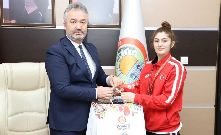 İşitme Engelliler Dünya Karate Şampiyonası’nda dünya üçüncüsü olan Sinem Özkan, 19 Mayıs Belediye Başkanı Osman Topaloğlu’nu makamında ziyaret etti.