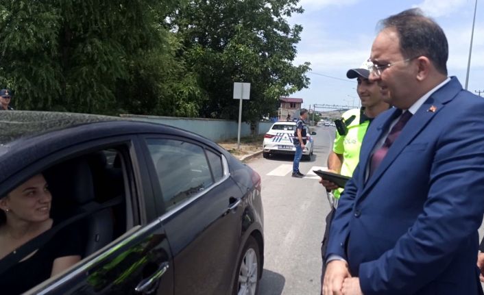 Samsun’un Bafra ilçesinde kontrol noktasında trafik denetimine katılan Kaymakam Cevdet Ertürkmen, sürücülere trafik kurallarına uymaları konusunda uyarılarda bulundu.