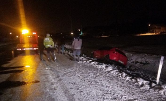 Samsun’un Alaçam ilçesinde kar yağışının ardından buzlanan yolda kayan otomobil kanala düştü.