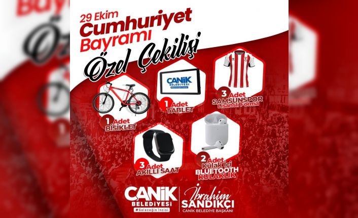 Samsun’un Canik Belediyesi tarafından, 29 Ekim Cumhuriyet Bayramı dolayısıyla düzenlenecek olan çekiliş ile çeşitli hediyeler dağıtılacak.