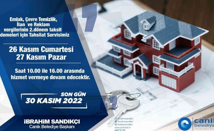 Canik Belediyesi tarafından emlak, çevre temizlik, ilan ve reklam vergilerinin ikinci taksit ödemelerinin son gününün 30 Kasım 2022 mesai bitimine kadar olduğu hatırlatarak, tahsilat servislerinin hafta sonu hizmet vermeye devam edeceği bildirildi.