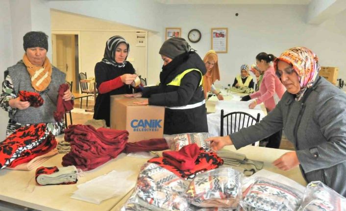 Canik Belediyesi Hanım Konakları’nda eğitim alan kursiyerler Kahramanmaraş’ta meydana gelen ve 10 ilde etkisini gösteren depremden etkilenen vatandaşların giyim ihtiyaçlarını karşılamak için seferber oldu. Kursiyerler, usta öğreticiler ve ilçedeki gönüllü kadınlar depremzedelerin soğuk hava şartlarından korunmaları için ihtiyaç duyduğu kışlık kıyafet, battaniye, atkı, bere ve pijama takımı üretiyor. Canik Belediyesi Hanım Konakları’nda üretilen ürünler paketlenip, hazır hele getirilerek deprem bölgesine gönderiliyor.