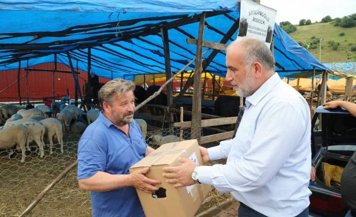Canik ilçesinde kurulan canlı hayvan pazarını ziyaret eden Belediye Başkanı İbrahim Sandıkçı, kurbanlık hayvan yetiştiricilerine hijyen paketi verdi.