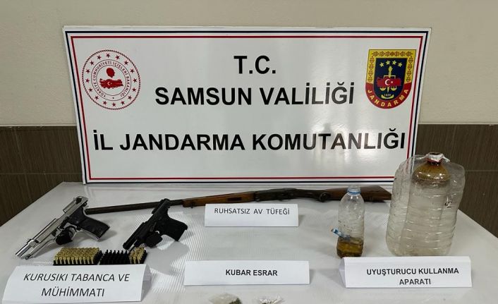 ARAMALARDA YAKLAŞIK 6 GRAM METAMFETAMİN, YAKLAŞIK 3 GRAM KUBAR ESRAR, 3 ADET UYUŞTURUCU KULLANMAYA YARAYAN DÜZENEK, 47 ADET SENTETİK ECZA HAPI, 1 ADET RUHSATSIZ TABANCA, 1 ADET RUHSATSIZ AV TÜFEĞİ, 2 ADET KURUSIKI TABANCA VE 70 ADET MERMİ ELE GEÇİRİLDİ