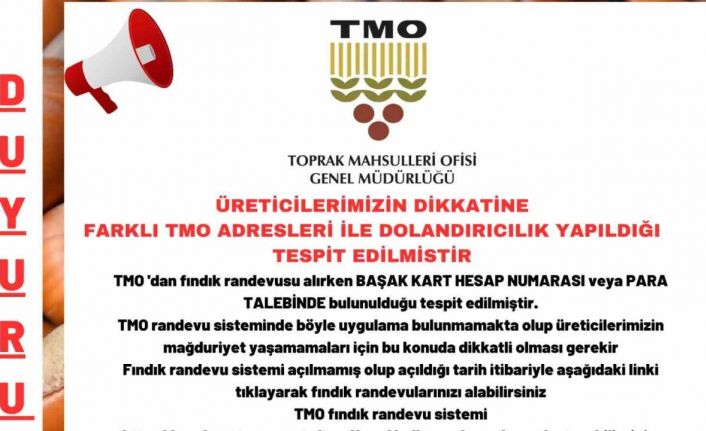 Muammer Aydemir, fındık hasat sezonu ile birlikte dolandırıcılık olaylarının yaşanabileceğine dikkat çekerek, “Farklı TMO adresleri ile fındık randevu sistemi oluşturularak dolandırıcılık yapıldığı tespit edilmiştir. TMO’dan fındık randevusu alırken kart bilgileri veya para talebinde bulunulduğu belirlenmiştir. TMO randevu sisteminde böyle uygulama yoktur. Üreticilerimizin mağduriyet yaşamamaları için bu konuda dikkatli olmaları gerekir. Fındık randevu sistemi henüz açılmamıştır. Açıldığı zaman TMO’nun resmi web sitesi üzerinden randevu alabilirler" dedi.