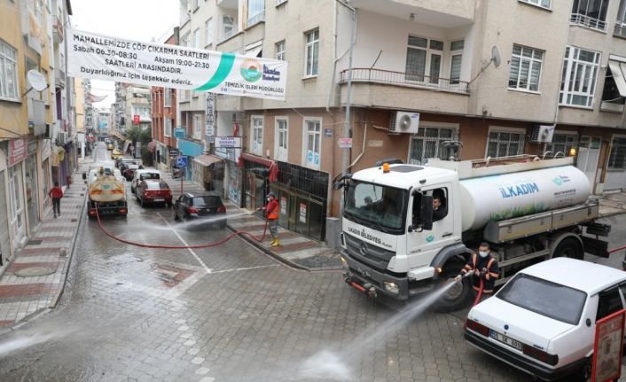 İlkadım Belediyesi yeni tip korona virüs (Covid-19) salgınıyla mücadele kapsamında uygulanan 54 saatlik sokağa çıkma kısıtlamasını fırsata çevirerek ilçedeki sokak, kaldırım, iş yeri önleri ve apartman girişlerini tazyikli suyla temizledi.