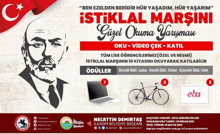 İlkadım Belediyesi, Milli Mücadele’nin simgesi olan İstiklal Marşı’nın çocuklar arasında daha iyi anlaşılması, gençlerin sanatsal yeteneklerini geliştirmelerine ve sergilemelerine imkan sağlanması amacıyla, 2021 İstiklal Marşı Yılı etkinlikleri kapsamında tüm lise öğrencilerini bu yarışmaya katılmaya davet ediyor. Yarışmaya İstiklal Marşı’nın ilk 10 kıtasını okuyarak video ile kayıt altına alan tüm özel ve resmi lise düzeyinde öğrenciler okul müdürlüklerine başvuru yapabilecekler. Son başvuru tarihi 30 Nisan 2021 olan yarışmanın; birincilik ödülü dizüstü bilgisayarı, ikincilik ödülü bisiklet, üçüncülük ödülü ise tablet olarak belirlendi.