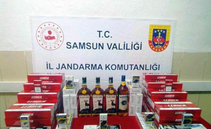 Samsun’da jandarma ekipleri tarafından şüphe üzerine durdurulan bir araçta yapılan aramada kaçak içki ve sigara ele geçirildi.