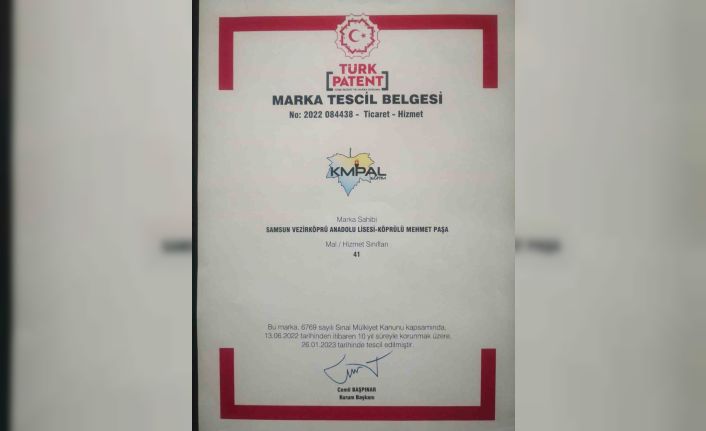 Samsun’un Vezirköprü ilçesinde bulunan Köprülü Mehmet Paşa Anadolu Lisesi “KMPAL Eğitim” marka adı ve yeni logosuyla Türk Patent ve Marka Kurumu’ndan ’Marka Tescil Belgesi’ aldı.