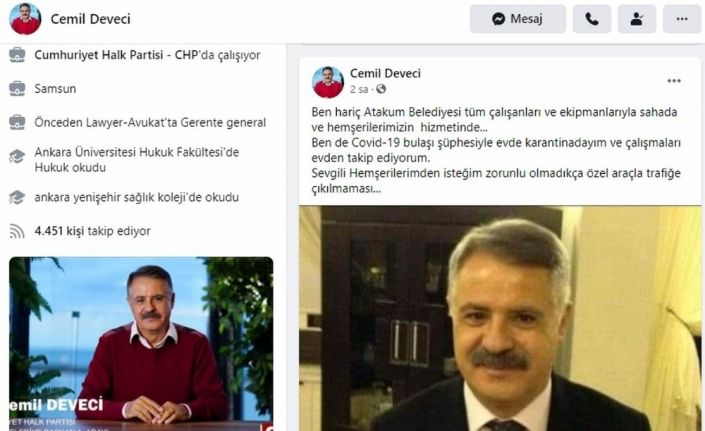 Sosyal medya hesabından açıklamalarda bulunan Atakum Belediye Başkanı Av. Cemil Deveci, “Ben hariç Atakum Belediyesi tüm çalışanları ve ekipmanlarıyla sahada ve hemşerilerimizin hizmetinde. Ben de Kovid-19 bulaşı şüphesiyle evde karantinadayım ve çalışmaları evden takip ediyorum. Sevgili hemşerilerimden isteğim zorunlu olmadıkça özel araçla trafiğe çıkılmaması” dedi.
