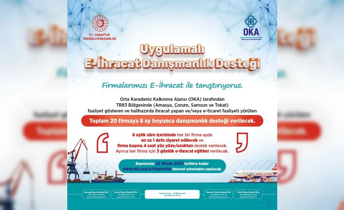 Orta Karadeniz Kalkınma Ajansı (OKA), bölge illerinde faaliyet gösteren ve e-ihracat yapmak isteyen işletmelere ücretsiz olarak “Uygulamalı E-İhracat Danışmanlık Desteği” sağlayacak.