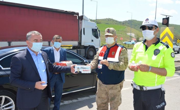 Havza Belediye Başkanı Sebahattin Özdemir, kontrol noktasında güvenlik güçlerine dezenfektan ve maske hediye gederek, "Allah güvenlik güçlerimizin yar ve yardımcısı olsun” dedi.