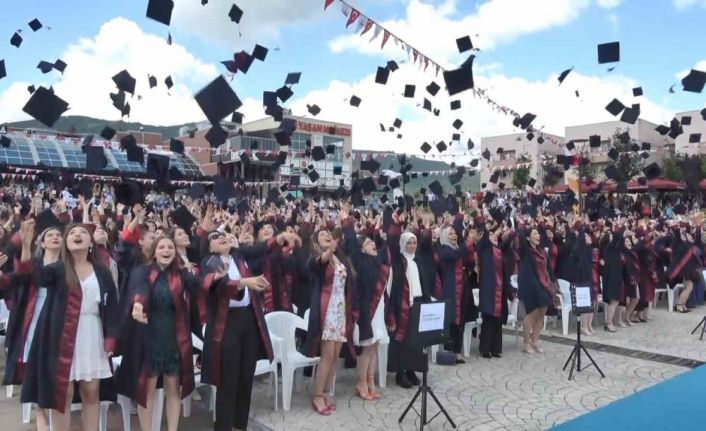 Düzenlenen mezuniyet töreni, Sağlık Bilimleri Fakültesi birincisi Belgin Kesen’in yaş kütüğüne plaket çakması ile birlikte öğrencilere diploma teslimi, yemin töreni ve kep atma ile sonra erdi.