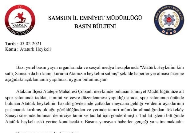 Yapılan açıklamada, “Bazı yerel basın yayın organlarında ve sosyal medya hesaplarında ‘Atatürk heykelini kim sattı, Samsun’da bir kamu kurumu Atamızın heykelini satmış’ şeklinde haberler yer alması üzerine aşağıdaki açıklamanın yapılması uygun bulunmuştur. Atakum ilçesi Atatepe Mahallesi Çobanlı mevkiinde bulunan Emniyet Müdürlüğümüze ait spor salonunda tadilat, tamirat ve çevre düzenlenmesi yapıldığı sırada, spor salonunun önünde bulunan Atatürk heykelinin bakalit gövdesinde çatlaklar meydana geldiği ve demir ayaklarının paslanarak kırılmış olduğu görüldüğünden ve yerinde tamiri mümkün olmadığından Tekkeköy sanayi sitesinde bulunan demirciye tamir ve tadilat için gönderilmiştir. Tadilat işlemi bittiğinde Atatürk heykeli eski yerine konulacaktır. Basına yansıyan haberler gerçeği yansıtmamaktadır” denildi.Samsun İl Emniyet Müdürlüğü’nden ’Atatürk heykeli’ açıklaması