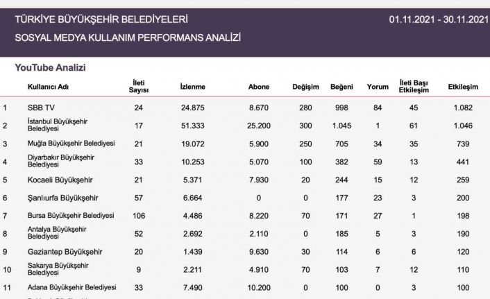 Samsun Büyükşehir Belediyesi’nin 2021 yılının Ocak ayında yayın hayatına başlayan YouTube kanalı SBB TV, tüm büyükşehir belediyelerinin içinde bulunduğu listede 1. sırada yer aldı. Sosyal Medya Araştırma Şirketi BoomSocial’ın paylaştığı Kasım ayı raporu verilerine göre SBB TV, İstanbul Büyükşehir Belediyesi’nin de önüne geçerek ‘etkileşim’ kriterinde zirvede yer buldu.