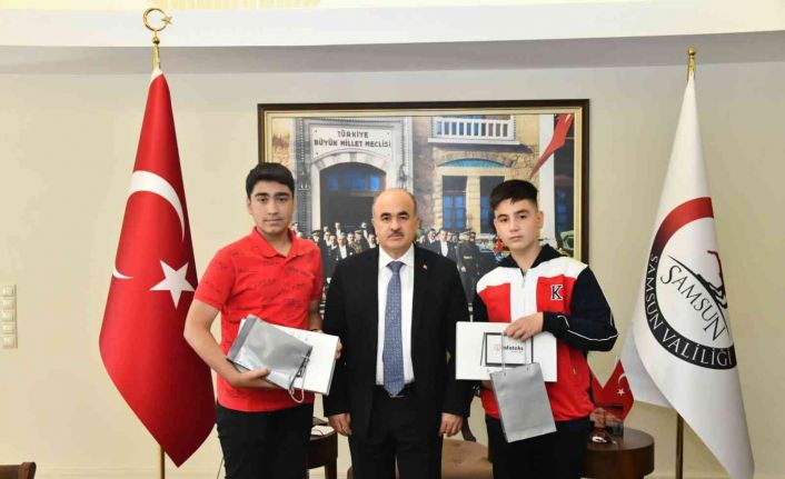 Samsun Valisi Doç. Dr. Zülkif Dağlı, 2022 Liseye Geçiş Sistemi (LGS) sınavında 500 tam puan alan Ahmet Furkan Pekşen ve Hasan Efe Karatay’ı tebrik ederek tablet hediye etti.